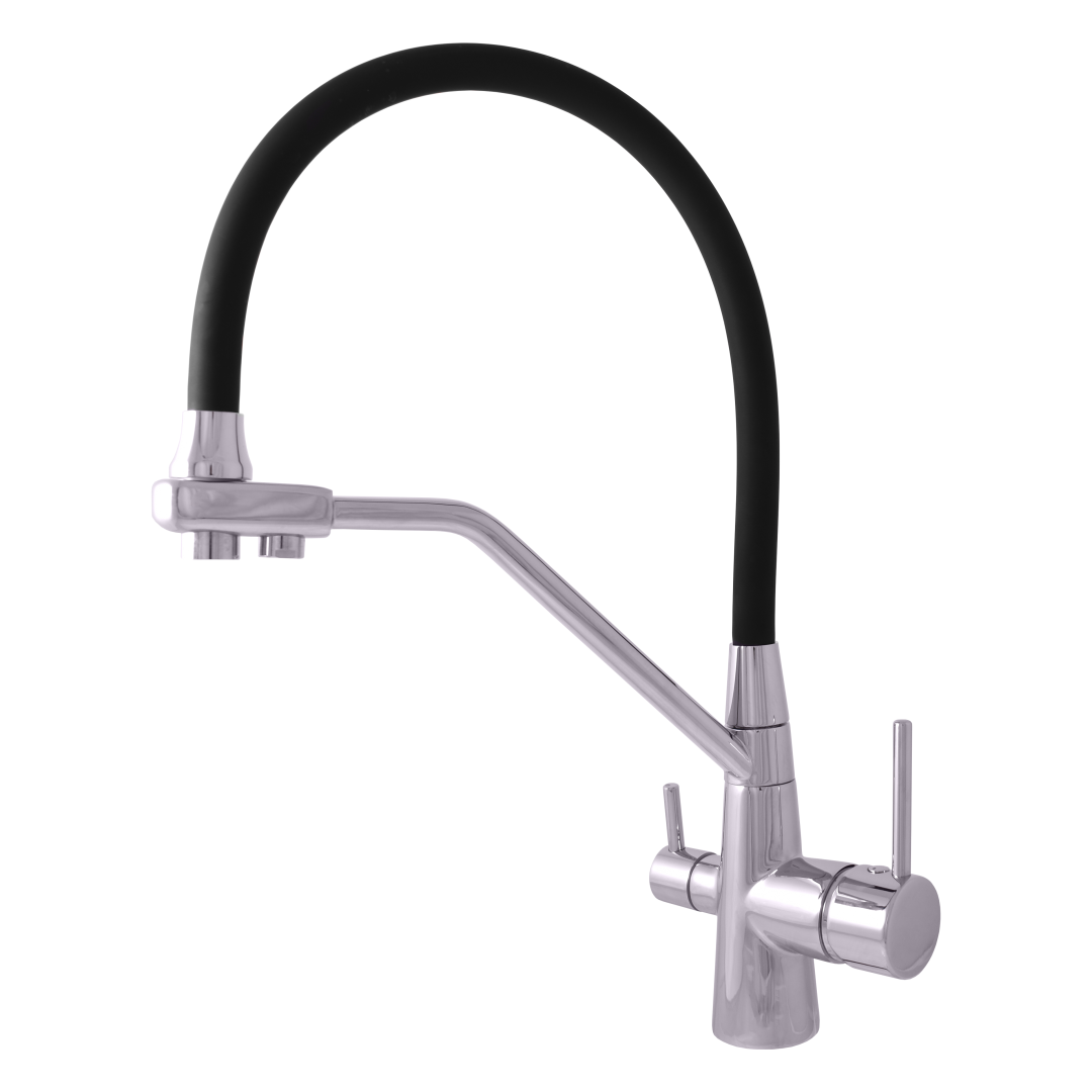 Kuchyňská trojcestná baterie Iris s černou výsuvnou, pružnou hubicí (funkce sprchy) a samostatným perlátorem na filtrovanou vodu. Český výrobek.