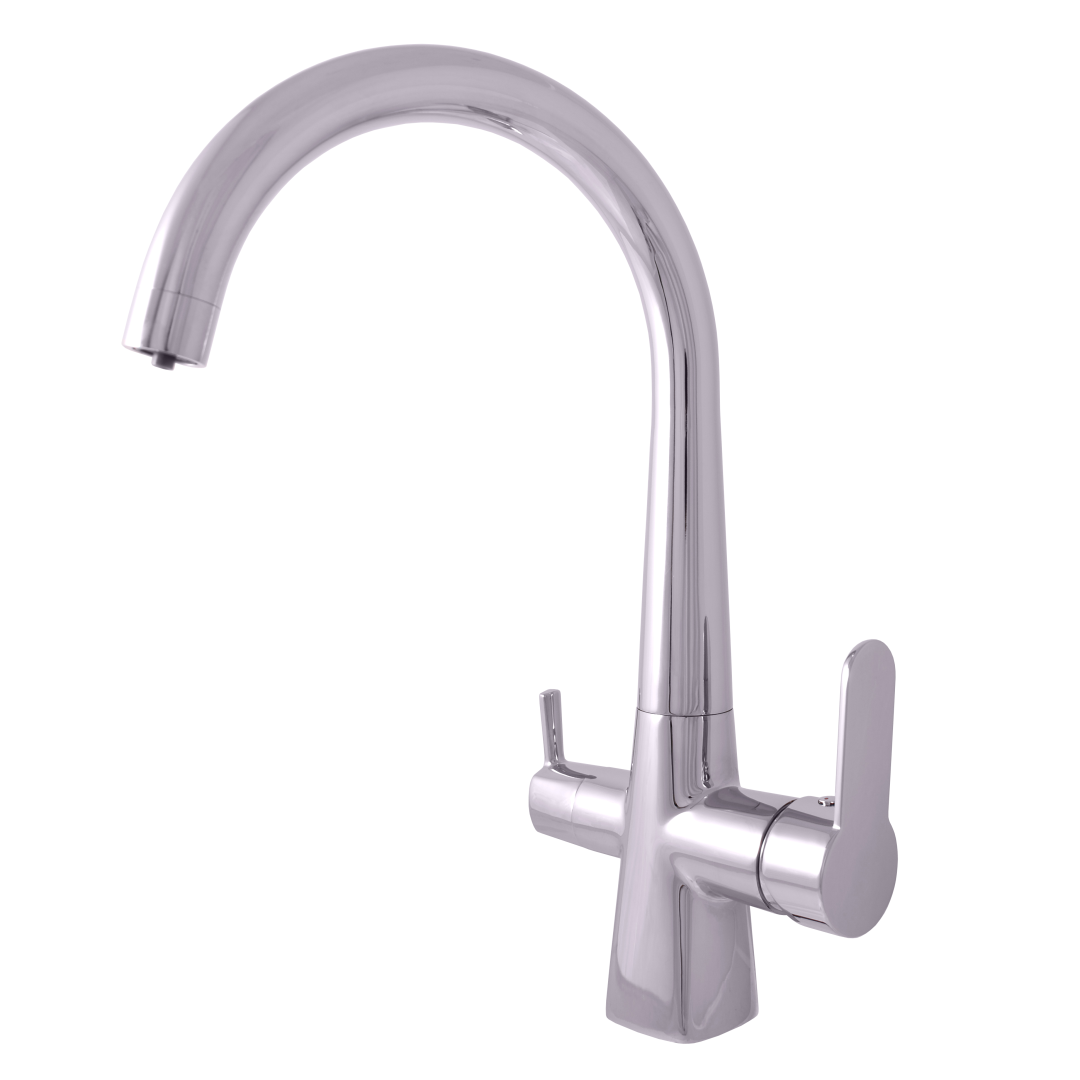 Trojcestná baterie Iris dřezová, pochromovaná, lesklá. Pro vodu teplou, studenou a vodu filtrovanou (vhodné zapojení pro filtry do přímého tlaku).