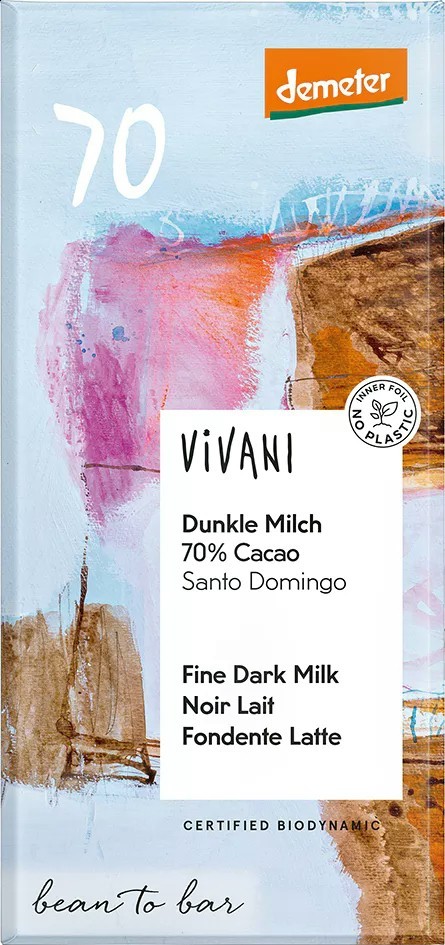 SLOŽENÍ: kakaová hmota**, kakaové máslo**, sušené odtučnené mléko** 16 %, řepný cukr**, Bourbon vanilka*. Všechny suroviny pocházejí z kontrolovaného ekologického zemědělství, suroviny označené ** pochází z biodynamického zemědělství. Obsah kakaové sušiny nejméně 70 %.
