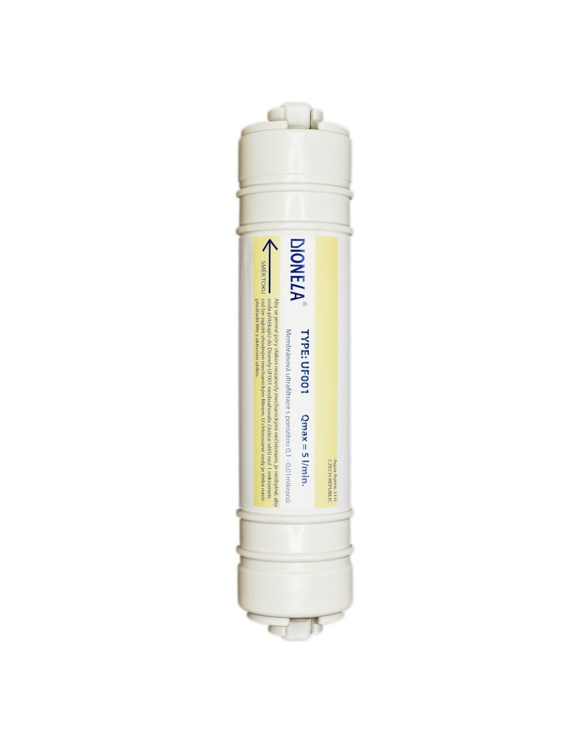 Dionela UF001 využívá membránovou ultrafiltraci s porozitou 0,01 mikrometru, materiál je polysulfon (PS). Porozita těchto vláken je zhruba 10x menší než u Dionely MSM, takže zachytí kromě bakterií, plísní a prvoků všechny viry, makromolekuly a koloidy. Oproti filtrům na principu reverzní osmózy má Dionela UF001 zhruba 10x větší porozitu, spolehlivě tedy propustí všechny minerály. Výborně se doplňuje s aktivním uhlím.
