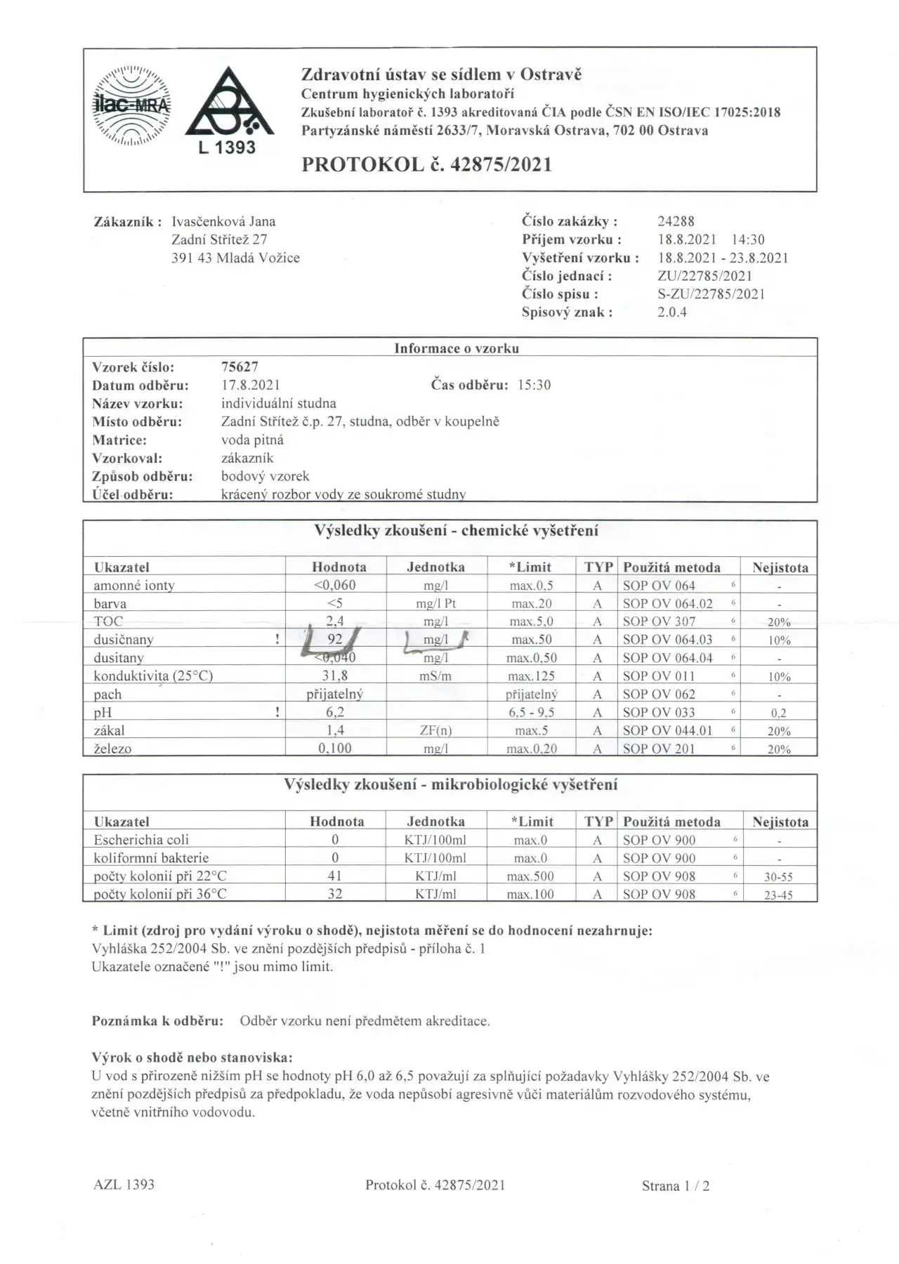 Na hygieně mě odradili od reverzní osmózy (že je dobrá pro stroje, ne pro lidi) a dali perfektní tip na firmu Agua Aurea. Jsem moc spokojená, jak s paní Jandovou tak s jejich montérem. Už nám doma frčí 2 bomby (Dionáty FDN2 a FAM1) a voda je parádní. Tím myslím na chuť. Frčí rychle a kvalitně, dusičnany srazila Dionáta dvojka pod 2 mg! Jednička je zas na pesticidy a tak. Prý vydrží do výměny asi 2 roky. Výměna je za rozumné peníze, takže nás litr super vody vyjde další roky něco málo přes korunu.