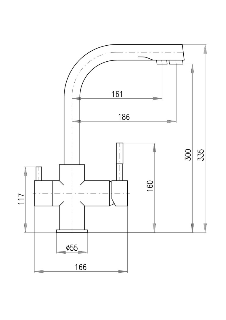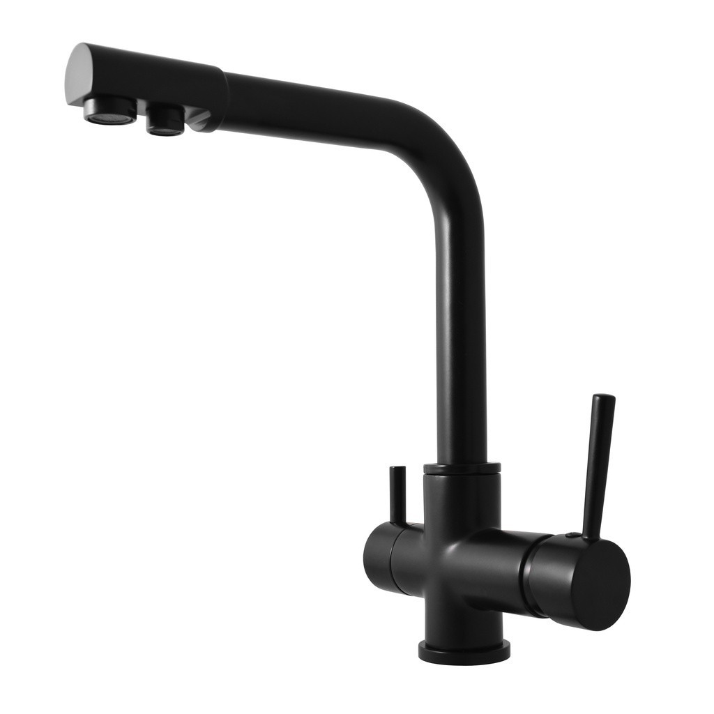 Trojcestná baterie Harmonia se dvěma perlátory pro oddělené čerpání užitkové a filtrované vody v matně černé barvě.