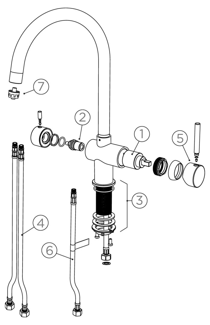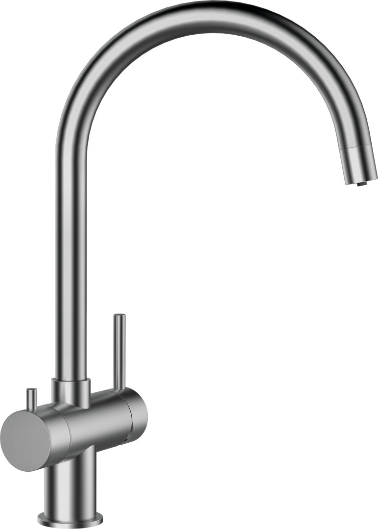 Stojánková dřezová baterie s možností připojení na užitkovou i filtrovanou vodu - má dvě páčky a kombinovaný perlátor, provedení Masivní nerezová ocel, výška 360 mm, pro otvor 35 mm, otočná o 360 °.