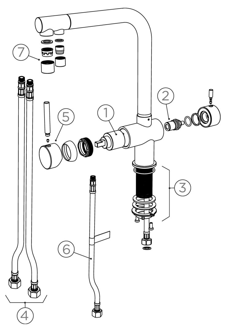Stojánková dřezová baterie s možností připojení na užitkovou i filtrovanou vodu - má dvě páčky a dva perlátory, provedení Puro (nástřik), výška 350 mm, pro otvor 35 mm, otočná o 360 °.