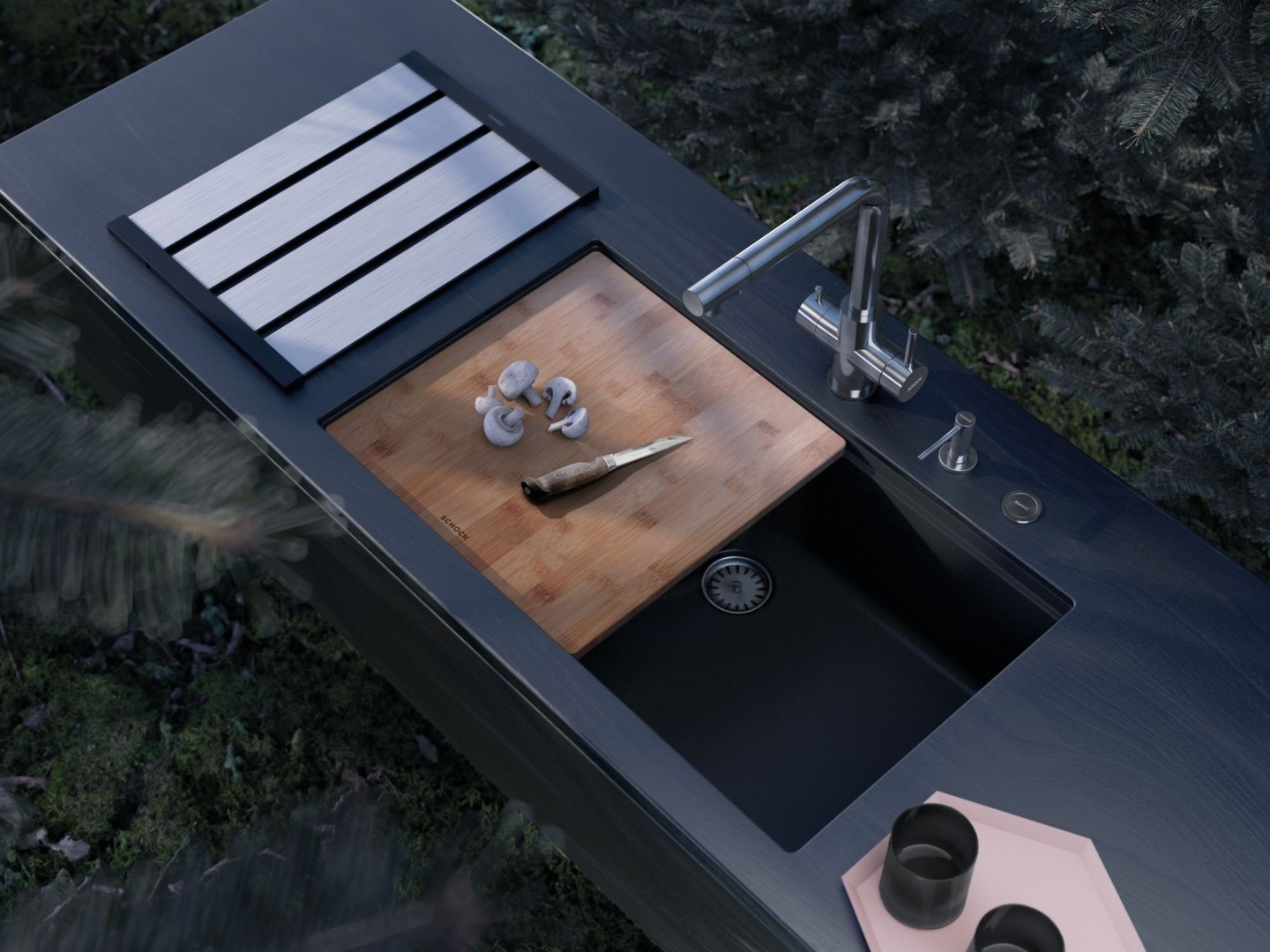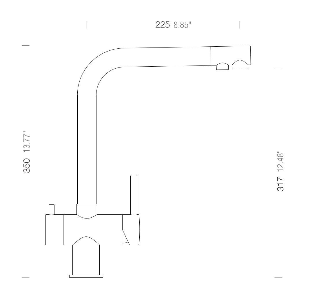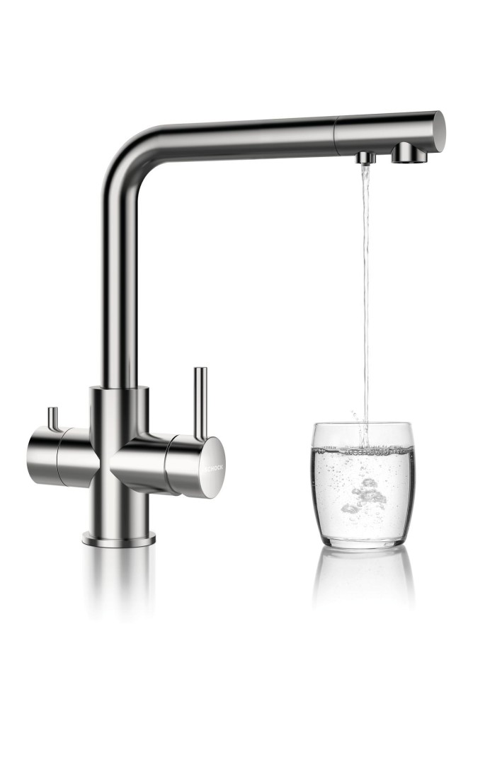 Stojánková dřezová baterie s možností připojení na užitkovou i filtrovanou vodu - má dvě páčky a dva perlátory, provedení Masivní nerezová ocel, výška 350 mm, pro otvor 35 mm, otočná o 360 °.