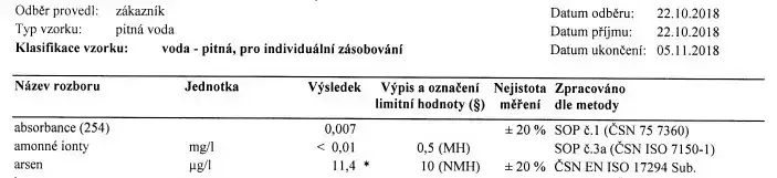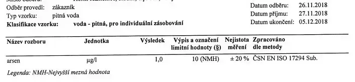 Je až neuvěřitelné kolik lidí s vlastní studnou neřeší obsah arsenu ve své vodě. Důvodem je bezesporu i to, že ani v základním a ani rozšířeném rozboru není zařazen jako standardní vyšetření a lze ho získat jen za příplatek. Ten není až tak velký cca 250,- Kč což považuji za minimální částku s ohledem na to, jak velké zdravotní riziko představuje zvýšená hodnota arsenu v pitné vodě.