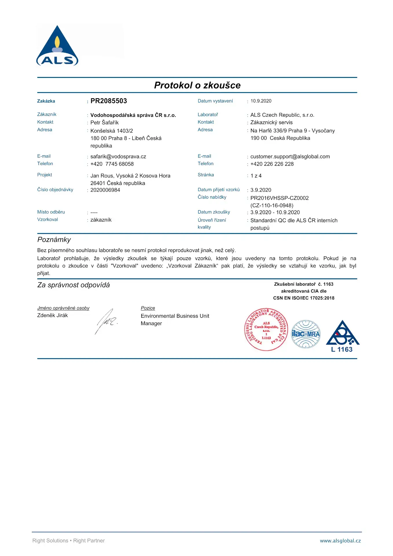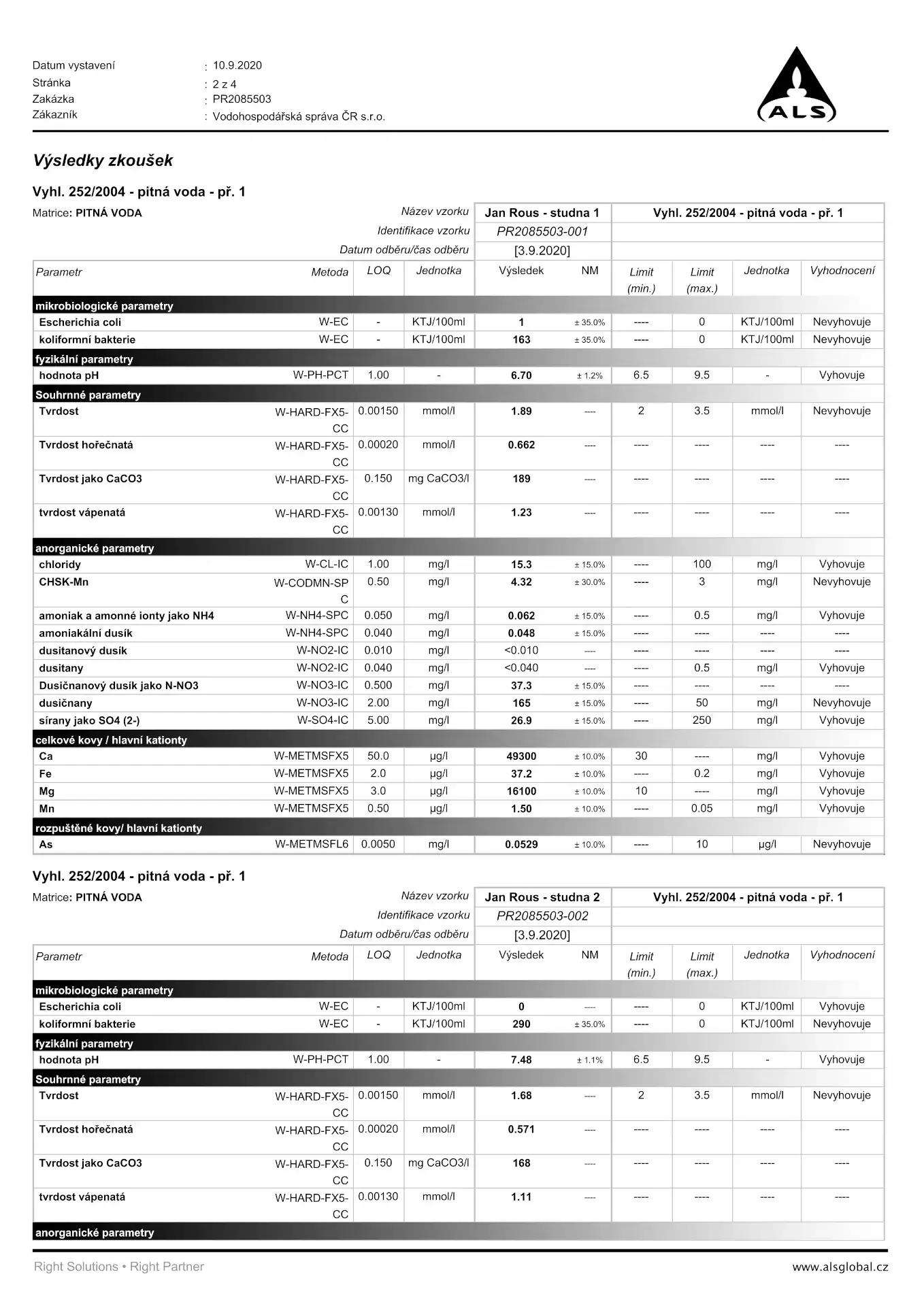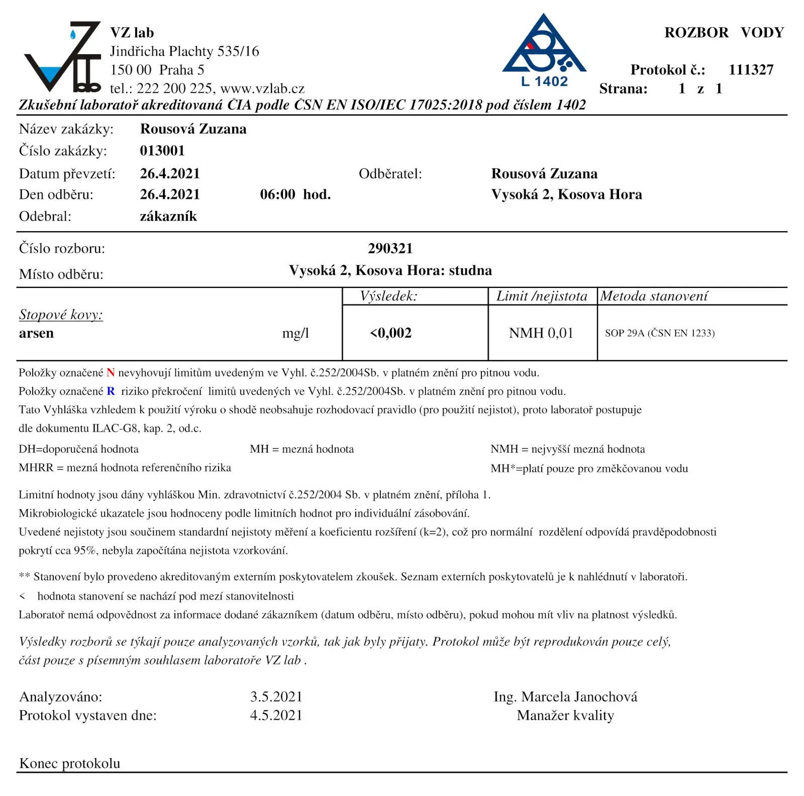 rádi bychom poděkovali Vaší firmě za úspěšné vyřešení problému s nadlimitním (4násobným) množstvím arsenu ve vodě v naší studni. Po zjištění přítomnosti arsenu ve vodě jsme museli kupovat a dopravovat balenou pitnou vodu, což bylo nejen náročné, ale i neekologické a každodenní množství plastového odpadu nám velice vadilo. Po instalaci tří filtrů Dionela jsme si nechali udělat znovu kontrolní rozbor vody a byli jsme velice rádi, že se množství arsenu snížilo z původních 41 µg/l na 2 µg/l a tím se voda znovu stala pitná.