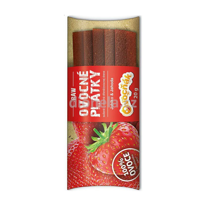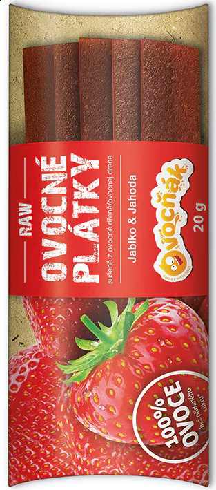 Tyto ovocné jablečno-jahodové plátky obsahují pouze 100 % českého ovoce bez přidaného cukru. Ovoce se při jejich zpracování nejprve nadrtí a poté usuší při nízké teplotě, aby nedocházelo ke ztrátě živin. Během sušení přijde ovoce o všechnu vodu, ale jeho chuť se tím zvýrazní. Do ovocných plátků nejsou přidávány žádné konzervanty, barviva či dochucovadla. Plátky poslouží jako skvělá zdravá svačinka jak pro děti, tak pro dospělé.