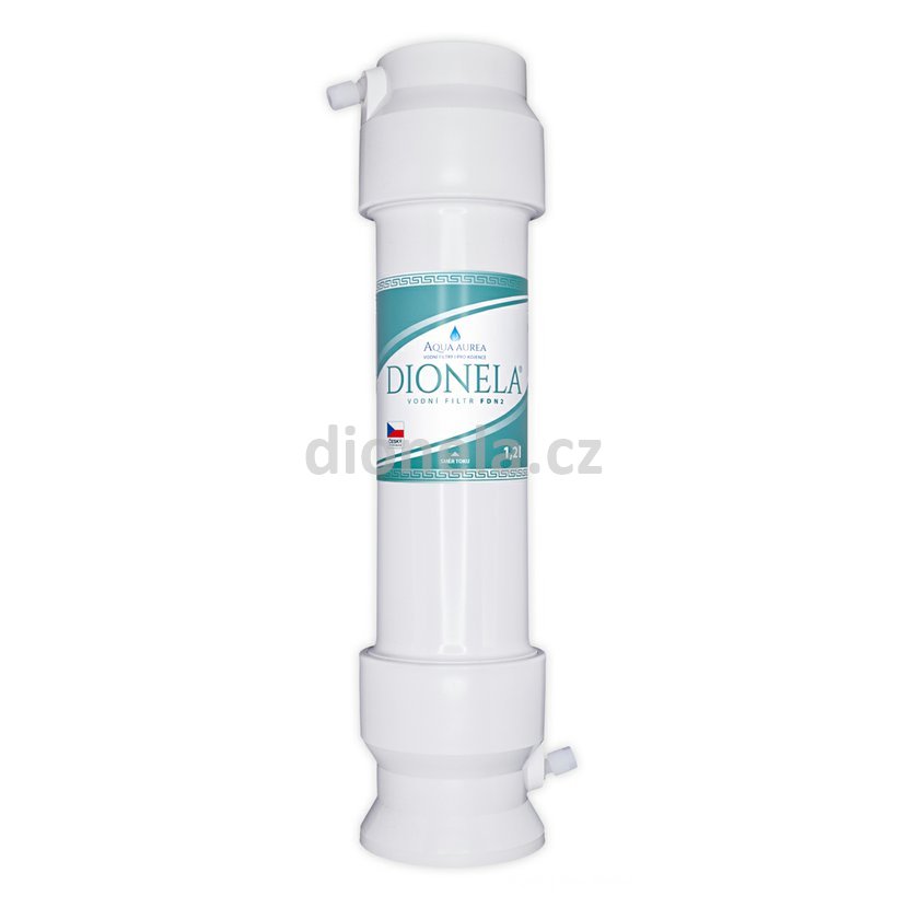 Druhý člen Dionely F2-1DUO Dionela FDN2 pod kuchyňskou linkou. Odstraňuje z vody dusičnany, dusitany, chlór a další látky.
