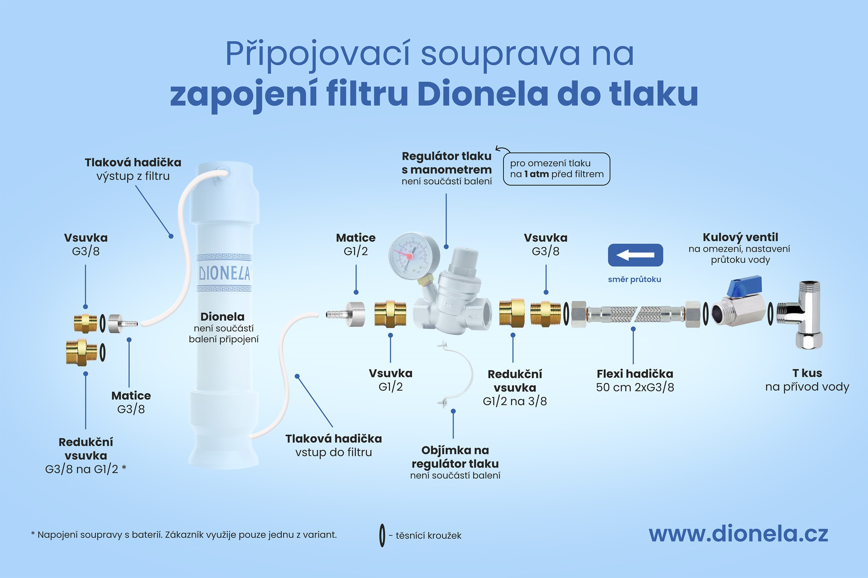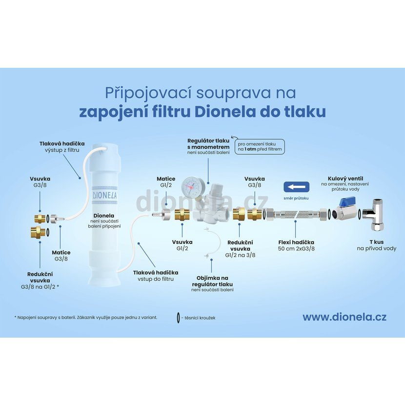Souprava jednotlivých instalatérských dílů, nutných na propojení rohového ventilu, u Vás v kuchyni (studená voda), s regulátorem tlaku (není součástí propojení), Dionelou a trojcestnou směšovací baterií.